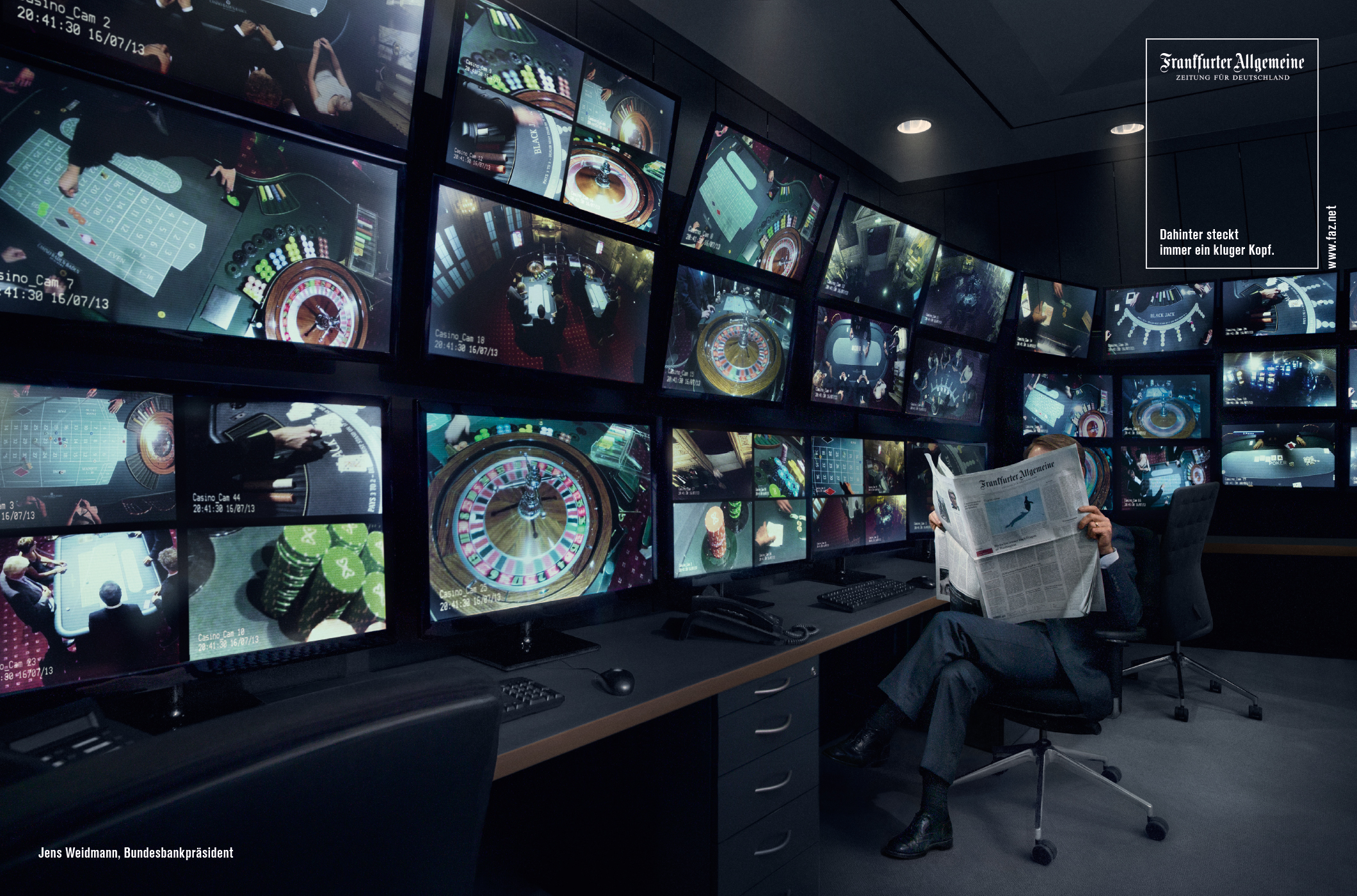 In einem abgedunkelten Raum stehen zahllose aneinandergereihte Bildschirme, die den Spielbetrieb in einem Casino zeigen. Black Jack, Roulette und Poker: Wer gewinnt, wer verliert? Alle Spieler hoffen auf ihr Können und ihr Glück. Vor den Kontrollmonitoren sitzt ein Mann und liest die F.A.Z.: Jens Weidmann, der Präsident der Deutschen Bundesbank. „Jedes Spiel braucht klare Regeln und das richtige Maß an Kontrolle – sei es auf den Finanzmärkten oder im Casino“, sagt er.