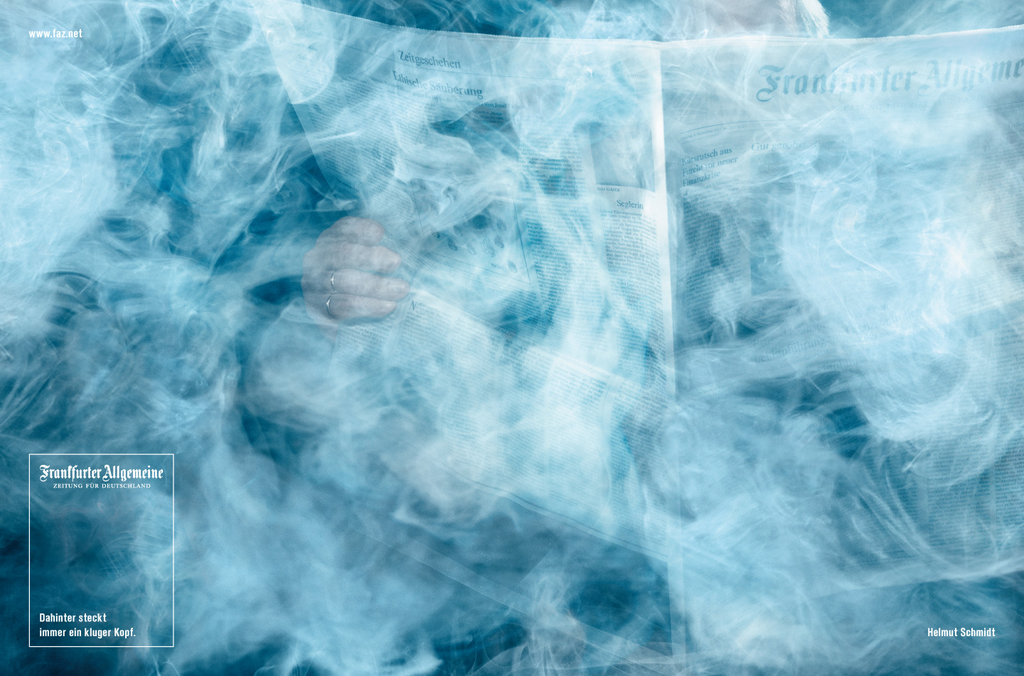 Eingehüllt in eine Rauchwolke sitzt Helmut Schmidt, vertieft hinter der Frankfurter Allgemeinen Zeitung (F.A.Z.). Das neue Motiv der „Kluge Köpfe“- Fotoserie zeigt so zwei große Leidenschaften des Altkanzlers: das Rauchen und das Zeitunglesen. Schmidts Neigung zu Nikotin ist genauso legendär wie der scharfe Intellekt des 93-Jährigen. Ans Aufhören hat Helmut Schmidt dabei nach eigenen Angaben nie gedacht: „Politiker müssen auf ihrem Felde Vorbild sein, aber nicht auf allen Feldern des menschlichen Lebens.“