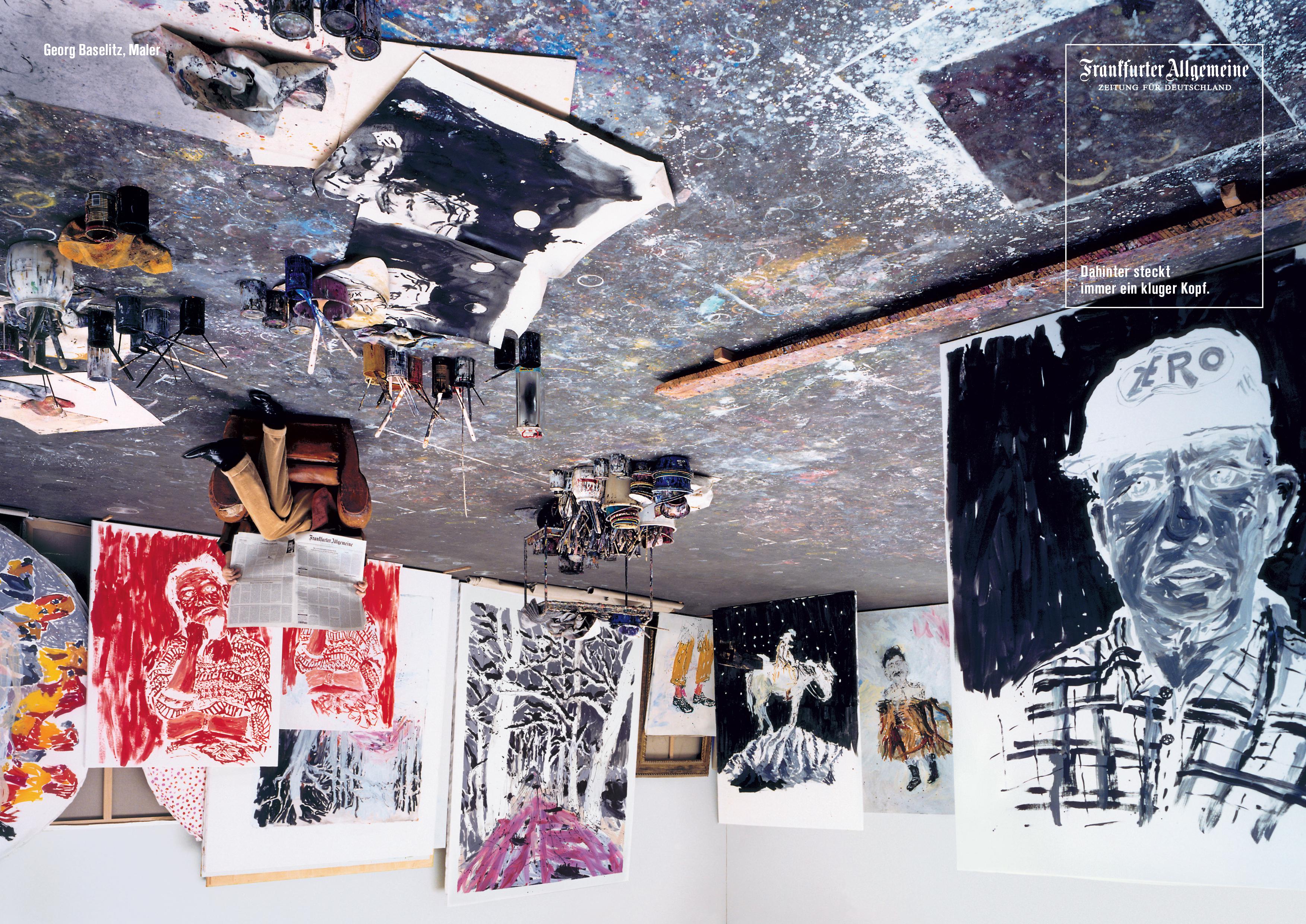 Georg Baselitz hat man so noch nie gesehen, ganz im Gegensatz zu seinen Bildern: Das neue Anzeigenmotiv der legendären Kampagne für die Frankfurter Allgemeine Zeitung stellt den deutschen Malerfürsten samt Atelier selbst auf den Kopf.