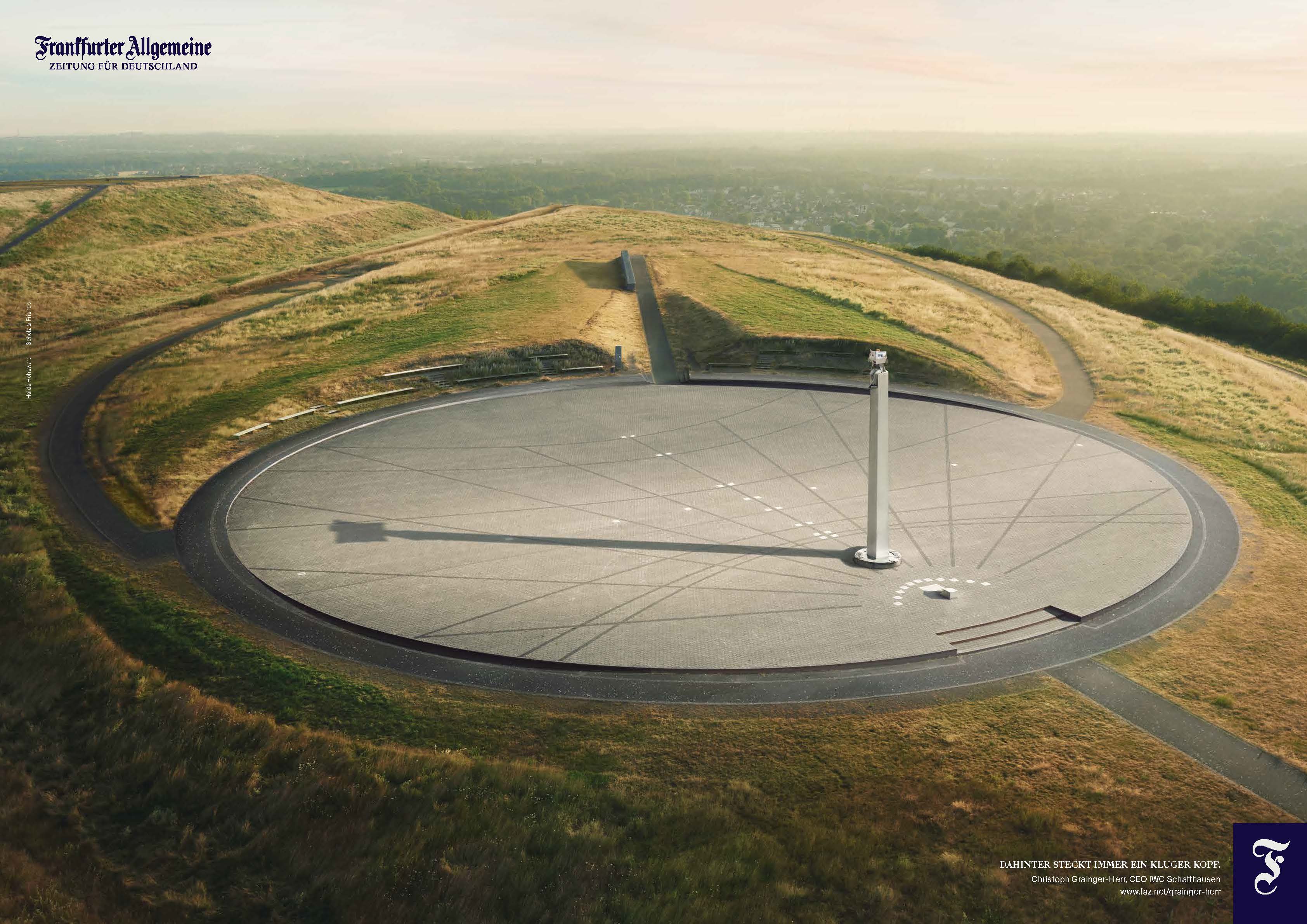 Yamina Grossmann, Leiterin Zentrales Marketing bei der F.A.Z.: „Mit dem neuen Motiv portraitieren wir Christoph Grainger-Herr als Persönlichkeit der Uhrmacherkunst und die Sonnenuhr der Halde Hoheward als herausragendes Objekt der Zeitgeschichte. Das 99. Motiv der Kampagne verbindet auf imposante Weise Aktualität und Zeitlosigkeit.“