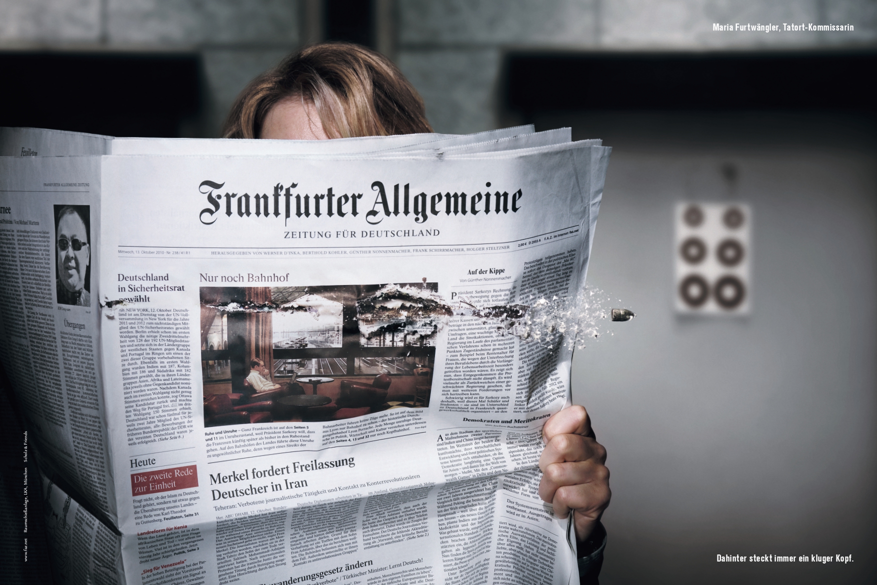 Blitzschnell und wie aus dem Nichts zerfetzt die Kugel eine Ausgabe der Frankfurter Allgemeinen Zeitung: Ihr aktueller Fall führt die beliebte Hannoveraner Ermittlerin Charlotte Lindholm zur F.A.Z.-Fotoserie. Für das neue Motiv lässt sich die Schauspielerin Maria Furtwängler hinter einer durchschossenen Zeitung fotografieren.