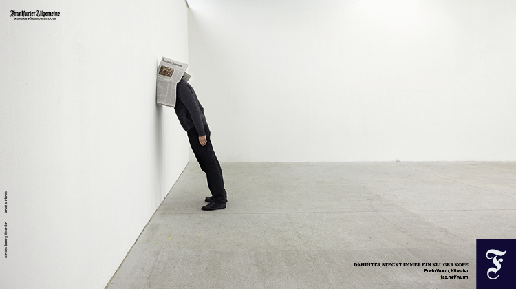 Der österreichische Künstler Erwin Wurm ist der neue Protagonist der preisgekrönten F.A.Z.-Kampagne „Dahinter steckt immer ein kluger Kopf“. Zum ersten Mal in der Geschichte der Serie gibt es mehrere Sujets mit derselben Persönlichkeit.