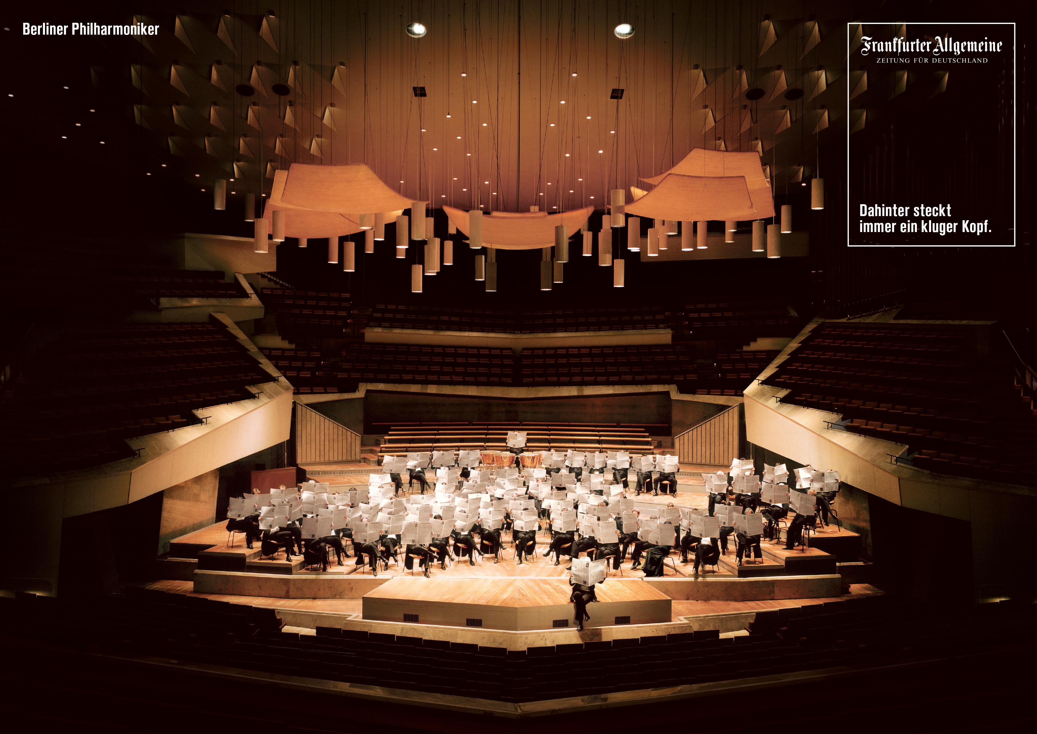 Die Frankfurter Allgemeine Zeitung zeigt einen historischen Moment: Unter Leitung von Sir Simon Rattle griffen die Berliner Philharmoniker zu einem bislang als Klangkörper unterschätzten Instrument. Sie nahmen die F.A.Z. zur Hand - nicht weniger virtuos als sonst Geigen und Trompeten. Damit diese historische Aufführung für die Nachwelt erhalten bleibt, erscheint sie als neuestes Motiv in der legendären F.A.Z.-Kampagne. Nach Michael Schumacher und Till Brönner setzt die F.A.Z. Damit einen weiteren glanzvollen Höhepunkt in der Klugen-Kopf-Kampagne.