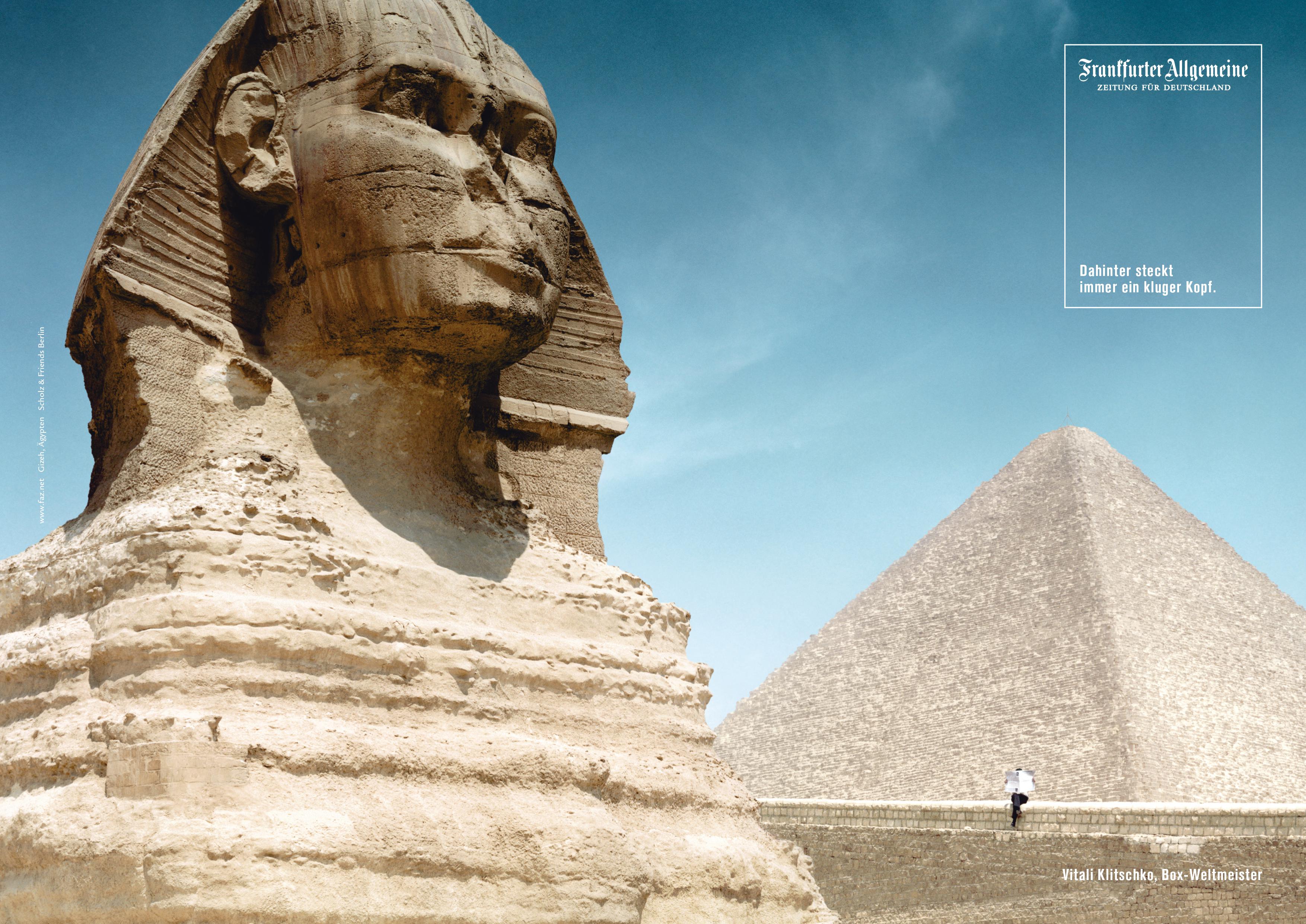 Was haben die Sphinx von Gizeh und der vielfache Box-Weltmeister Vitali Klitschko gemeinsam? Ein markantes Profil im Nasenbereich und Köpfchen.Wie man sich das genau vorzustellen hat, zeigt das aktuelle Motiv der „Dahinter steckt immer ein kluger Kopf“-Kampagne für die Frankfurter Allgemeine Zeitung.