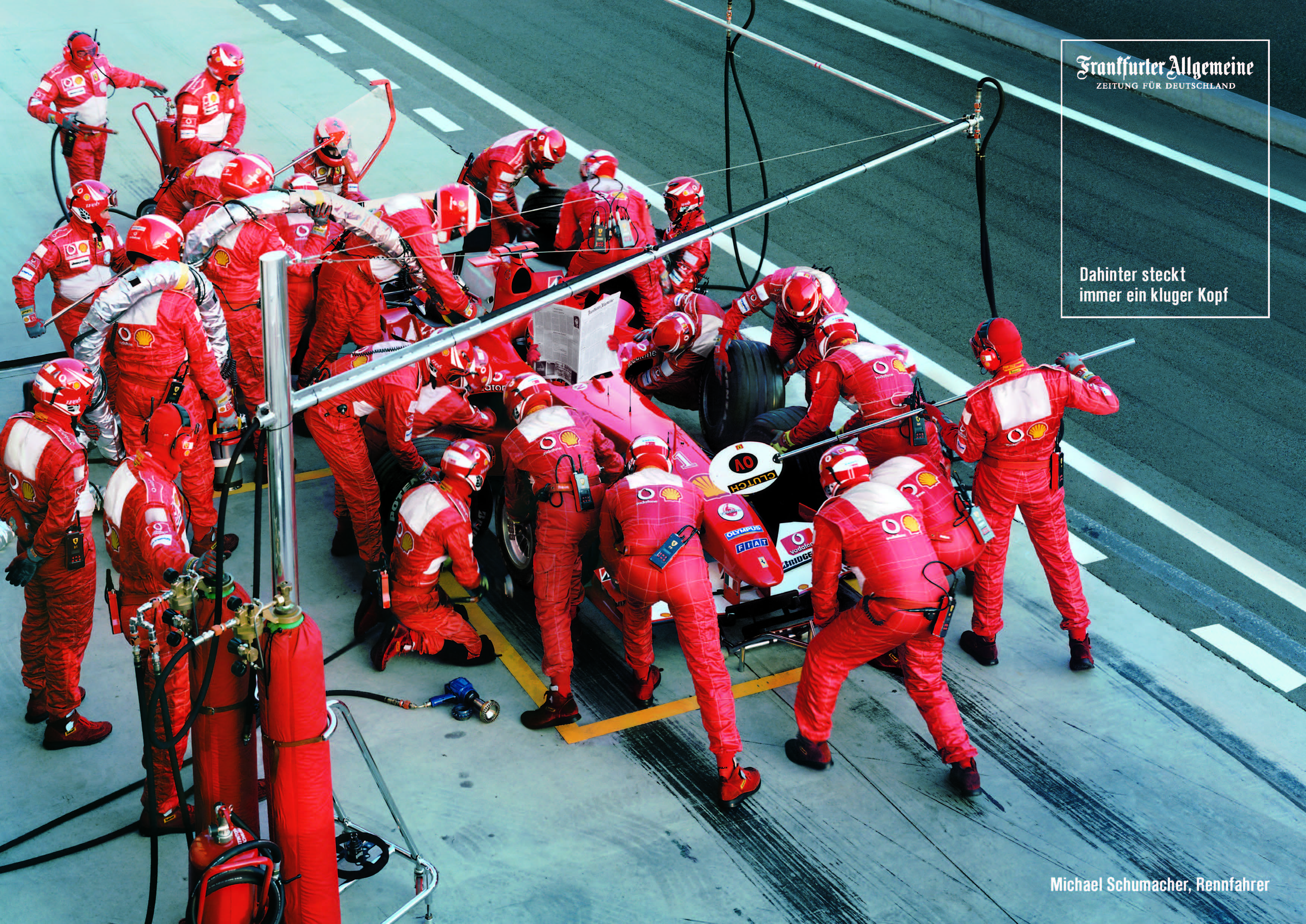 Das erste Motiv ist gleich eine Sensation: Es zeigt den Formel-1-Rekord-Weltmeister Michael Schumacher. Der bekannteste lebende Deutsche ist bei einem Boxenstopp zu sehen. Fünfundzwanzig Mechaniker machen seinen Wagen fit für die nächsten Runden. Was macht Schumacher in der sekundenkurzen Pause? Er wirft einen Blick in die Frankfurter Allgemeine Zeitung. Schumacher ist regelmäßiger Leser der F.A.Z.: „Ihr sachlicher, analytischer Stil kommt meinem Naturell entgegen und außerdem ist sie überall auf der Welt zu bekommen“, sagt der Weltenbummler.