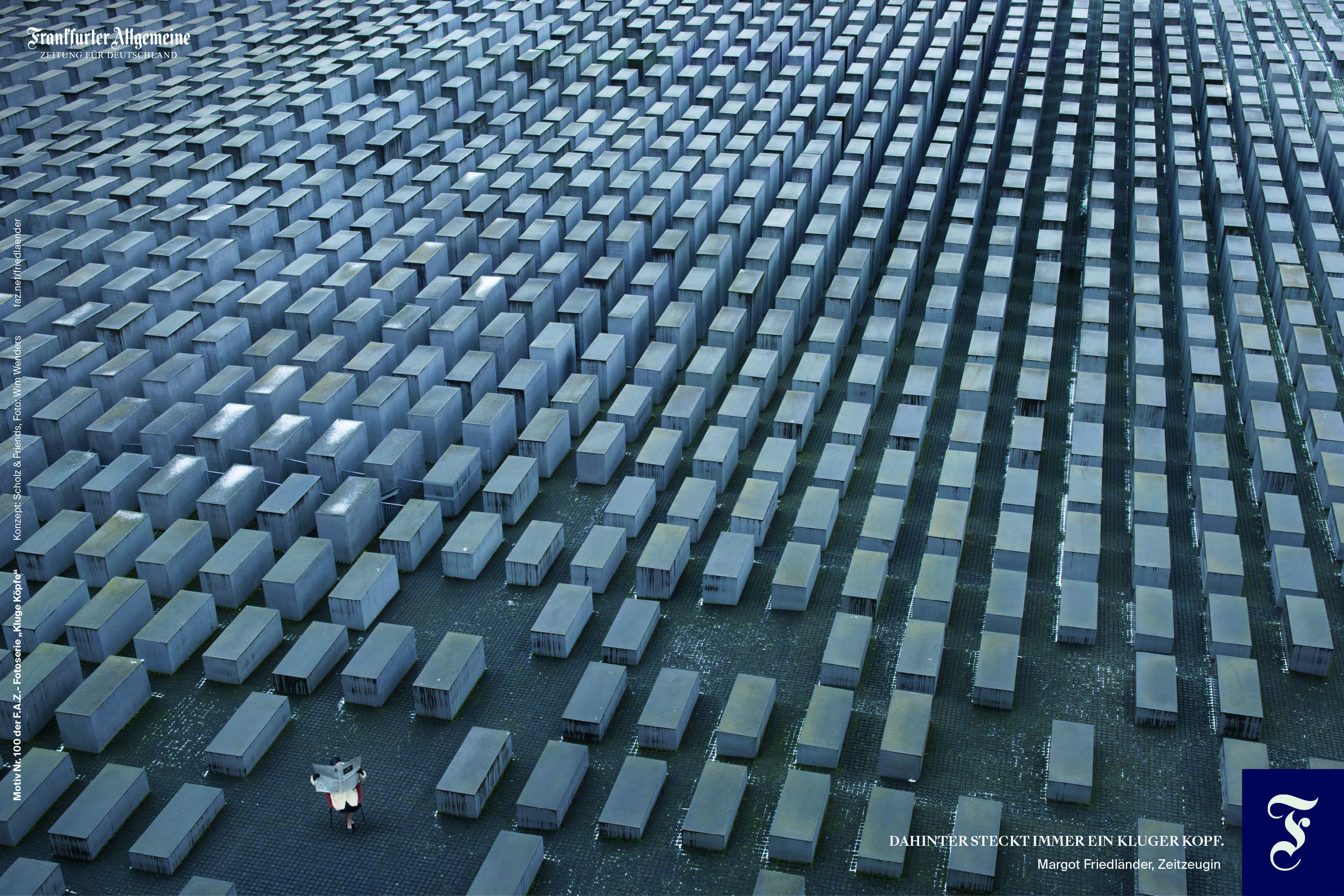 Frankfurt, 26. Januar 2024 – Umgeben von mehr als 2700 Betonstelen, die an die ermordeten Jüdinnen und Juden in Europa erinnern, sitzt eine Frau, die den Holocaust überlebt hat: Margot Friedländer. Mit der Zeitung in den Händen und der Geschichte vor Augen ist die 102-Jährige die Protagonistin des 100. Motivs der preisgekrönten F.A.Z.-Kampagne „Dahinter steckt immer ein kluger Kopf“. Für sie selbst ist das Denkmal für die ermordeten Juden Europas in Berlin der richtige Ort, um die Relevanz der Geschichte für die Gegenwart zu verdeutlichen: „Es soll zeigen: Seht, das waren Menschen genau wie ihr, die es damals nicht geschafft haben“, sagt Friedländer.